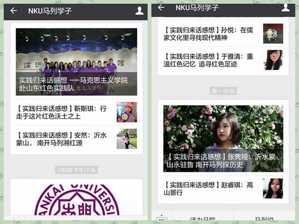 实践结束后,马院师生依托“NKU马列学子”微信平台,开展“实践归来话感想”专题推送,旨在通过分享实践收获和感想,进一步领悟红色革命文化、社会主义先进文化和优秀传统文化的深刻内涵,并以此方式感染和引导身边更多的青年坚定中国特色社会主义的道路自信、理论自信、制度自信和文化自信。实践队负责人靳斯琪谈到,“实践队参观了华东革命烈士陵园、沂蒙革命纪念馆、孟良崮战役纪念馆等。七天的红色沃土之行,从红色文化到社会主义先进文化再到传统文化,我们都有了更深的体悟和理解。”研究生实践队员安然表示,“钟灵毓秀的沂蒙大地孕育了光辉灿烂的历史文明,更孕育了朴实的沂蒙人民,伟大的革命英烈。返程已有几日,耳边尤绕着朴实的沂蒙大娘在大青山为队员们清唱的沂蒙小调。而自小扎根在心里的沂蒙情愫,似乎正在破土而出,生根发芽,作为文化基因融进我的信念与行动里。”