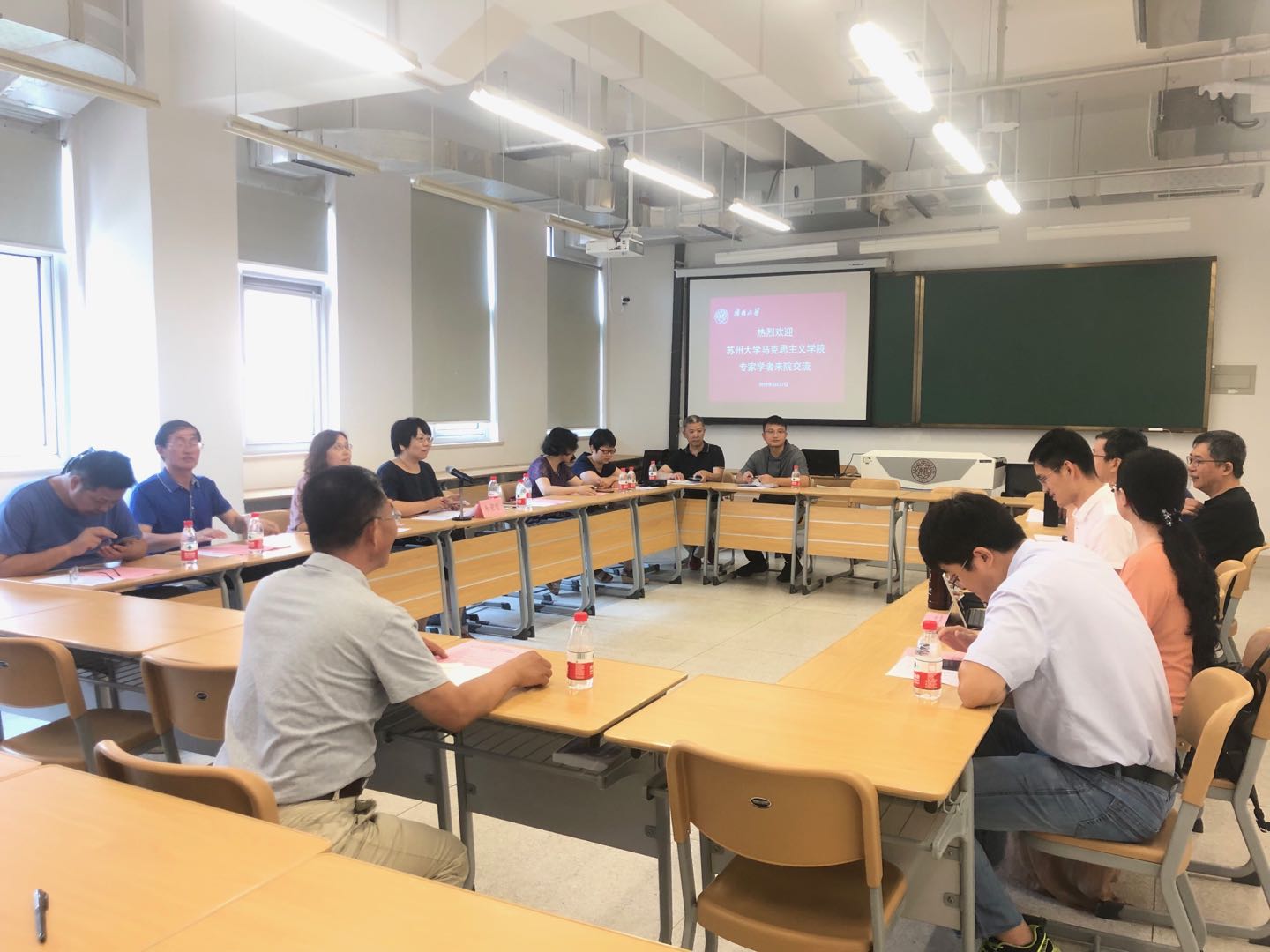 6月27日上午,苏州大学必威BETWAY西汉姆联副院长朱蓉蓉、马克思主义基本原理概论教研室主任范俊玉、副主任李莉一行9人来我院交流考察。学院副院长孙寿涛、马克思主义基本原理概论教研室主任陈弘、马克思主义基本原理概论教研室吴克峰、刘明明、石镇平、叶冬娜、竟辉等老师参加了座谈交流。