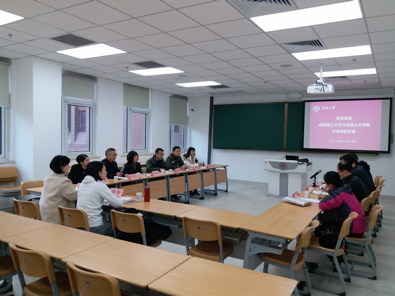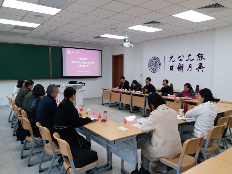 11月15日,成都理工大学必威BETWAY西汉姆联思政理论与实践教学中心副主任廖怀高、本科思政教学部主任辜帆一行8人来我院交流。学院孙寿涛副院长主持了座谈会,本科教学部主任余一凡、纲要教研室李国忠、基础教研室姚静、概论教研室孙炳炎等教师参加了座谈会。