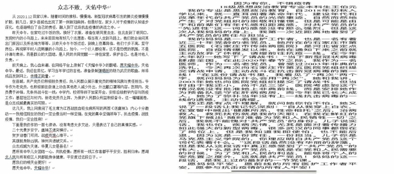 本科生王伯元同学《因为有你,不惧疫情》用朴实的文字记录身边亲人奔赴前线展现“舍小家为大家”的情怀,让人们看到每一个医护人员在疫情前用无私奉献和医者仁心为人民撑起生命健康的钢铁防线。王增沛同学在《众志成城,天佑中华》结尾说出每一个中华儿女的共同的心声:“愿我们的明天会更好!愿天佑中华,天耀中华!”