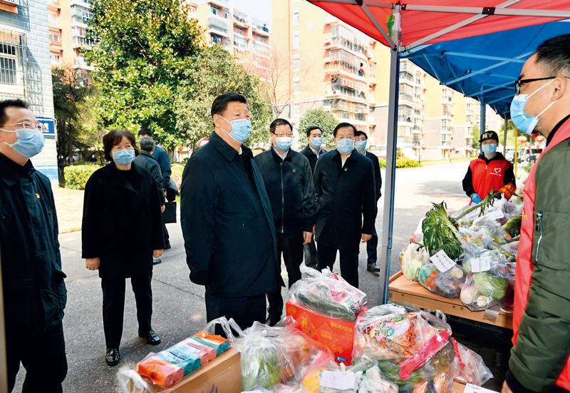 2020年3月10日,中共中央总书记、国家主席、中央军委主席习近平专门赴湖北省武汉市考察新冠肺炎疫情防控工作。这是习近平在东湖新城社区生活物资集中配送点,详细询问社区群众生活物资采购和供应情况。 新华社记者 谢环驰/摄
