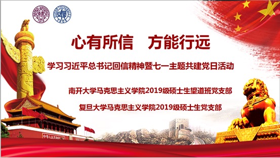 初心不改,九九如一。为庆祝中国共产党成立99周年,认真学习习近平总书记给复旦大学《共产党宣言》展示馆党员志愿服务队全体队员回信精神,重温习近平总书记给Betway体育西汉姆联8名参军入伍学生回信精神,激发青年党员将爱国之心化为报国之行的热情,在“七一”建党节当天,必威BETWAY西汉姆联2019级硕士生望道班党支部联合复旦大学必威BETWAY西汉姆联2019级硕士生党支部开展以“心有所信 方能行远”为主题的联学共建党日活动。必威BETWAY西汉姆联党委副书记、副院长刘一博老师,复旦大学必威BETWAY西汉姆联党委副书记潘孝楠老师,双方党支部全体党员、部分入党积极分子通过网络平台参加本次活动。