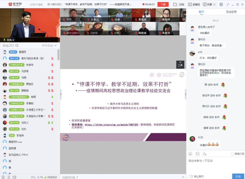 为学习贯彻落实全国教育大会、全国高校思想政治工作会议、学校思想政治理论课教师座谈会精神,更好地总结疫情期间思想政治理论课线上教学经验,进一步改进教学方法、深化教学改革、探索多元教学模式、提升教学质量,必威BETWAY西汉姆联联合天津市高校习近平新时代中国特色社会主义思想研究联盟,于6月24日在优学院直播课堂开展以“停课不停学、教学不延期、效果不打折”为主题的疫情期间高校思想政治理论课教学经验交流会。会议由必威BETWAY西汉姆联副院长孙寿涛主持,全市高校思想政治理论课教师同行参加了本次会议。