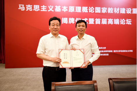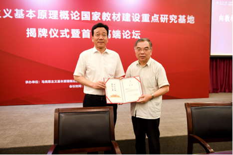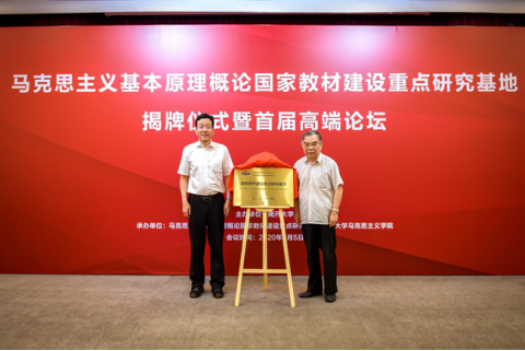9月5日,“高校思想政治理论课马克思主义基本原理概论国家教材建设重点研究基地”揭牌仪式暨首届高端论坛在Betway体育西汉姆联举行。Betway体育西汉姆联党委书记杨庆山,毛泽东思想和中国特色社会主义理论体系概论国家教材建设重点研究基地主任、北京大学博雅讲席教授顾海良应邀共同为基地揭牌。Betway体育西汉姆联副校长王新生主持揭牌仪式。