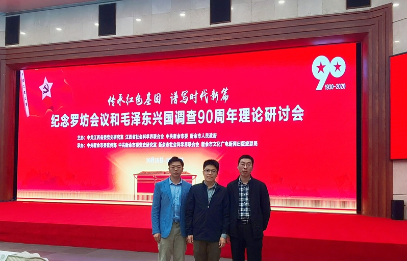 2020年10月16日,由中共江西省委党史研究室、江西省社会科学界联合会、中共新余市委、新余市人民政府主办,中共新余市委宣传部、中共新余市委党史研究室、新余市社会科学界联合会、新余市文化广电新闻出版旅游局承办的“传承红色基因,谱写时代新篇”纪念罗坊会议和毛泽东兴国调查90周年理论研讨会在江西省新余市举行。江西省新余市委书记蒋斌出席并致辞。原中共中央党史研究室副主任龙新民,原通信指挥学院教授、少将牛力,开国少将罗章之子、国防大学战略学教授、大校罗海曦,中国人民解放军军事科学院历史研究生原主任刘庭华,《苏区研究》主编、原中共江西省委党史研究室副主任何友良受邀出席并作发言。我院教师刘一博、硕士研究生张登彬受邀参会。