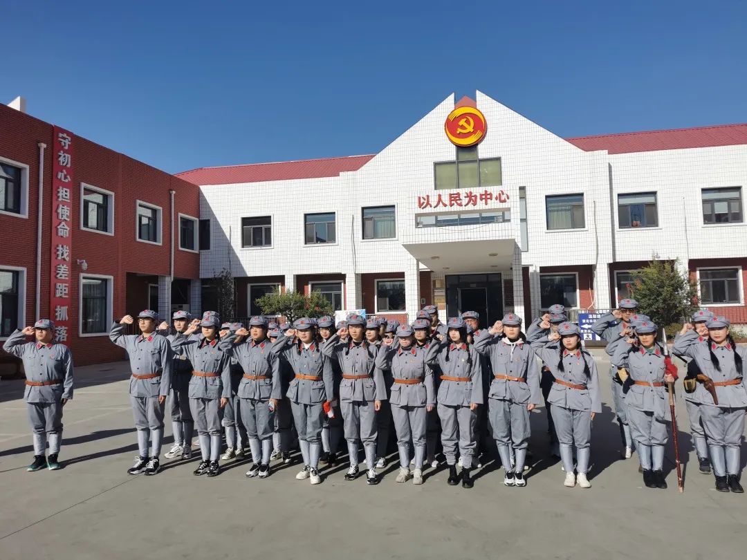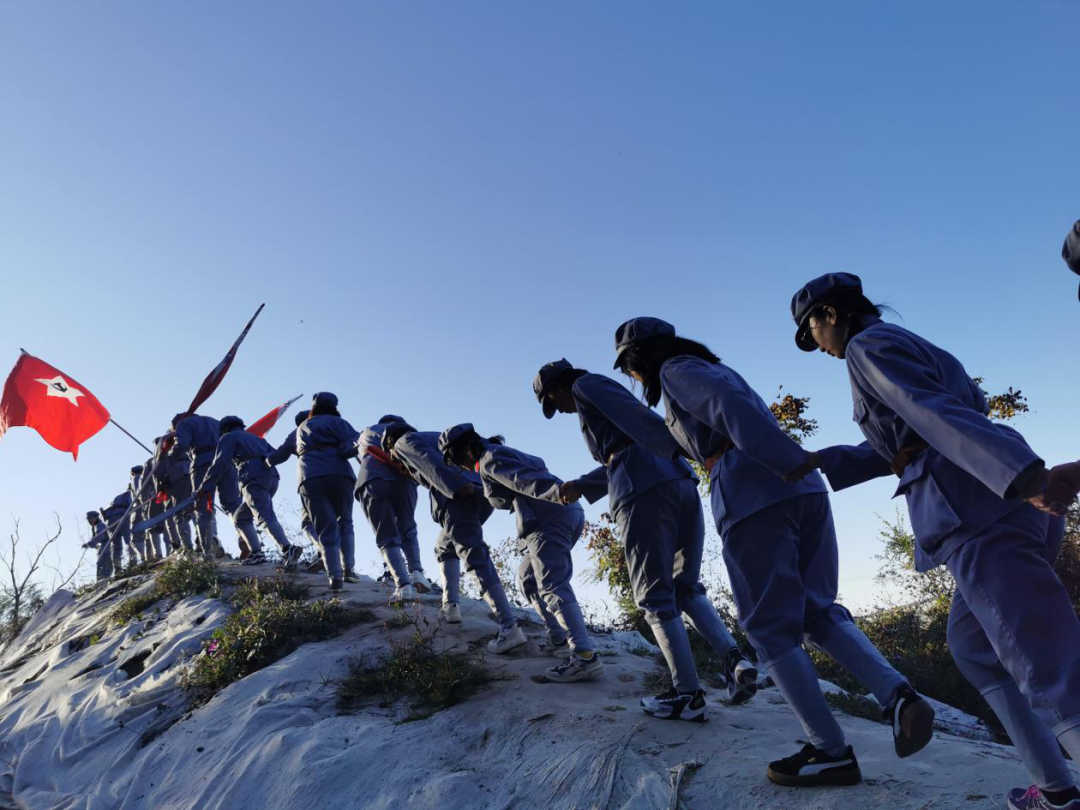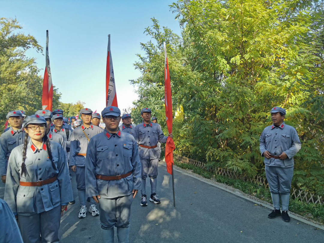 秋风习习,红旗高展。到达第六埠村后,师生们在工作人员的指引下换上整齐的红军服装,共同观看红军纪录片,重温入党誓词,并进行了授旗仪式。授旗仪式结束后,在教官的带领下,师生们阔步走上“长征”路。