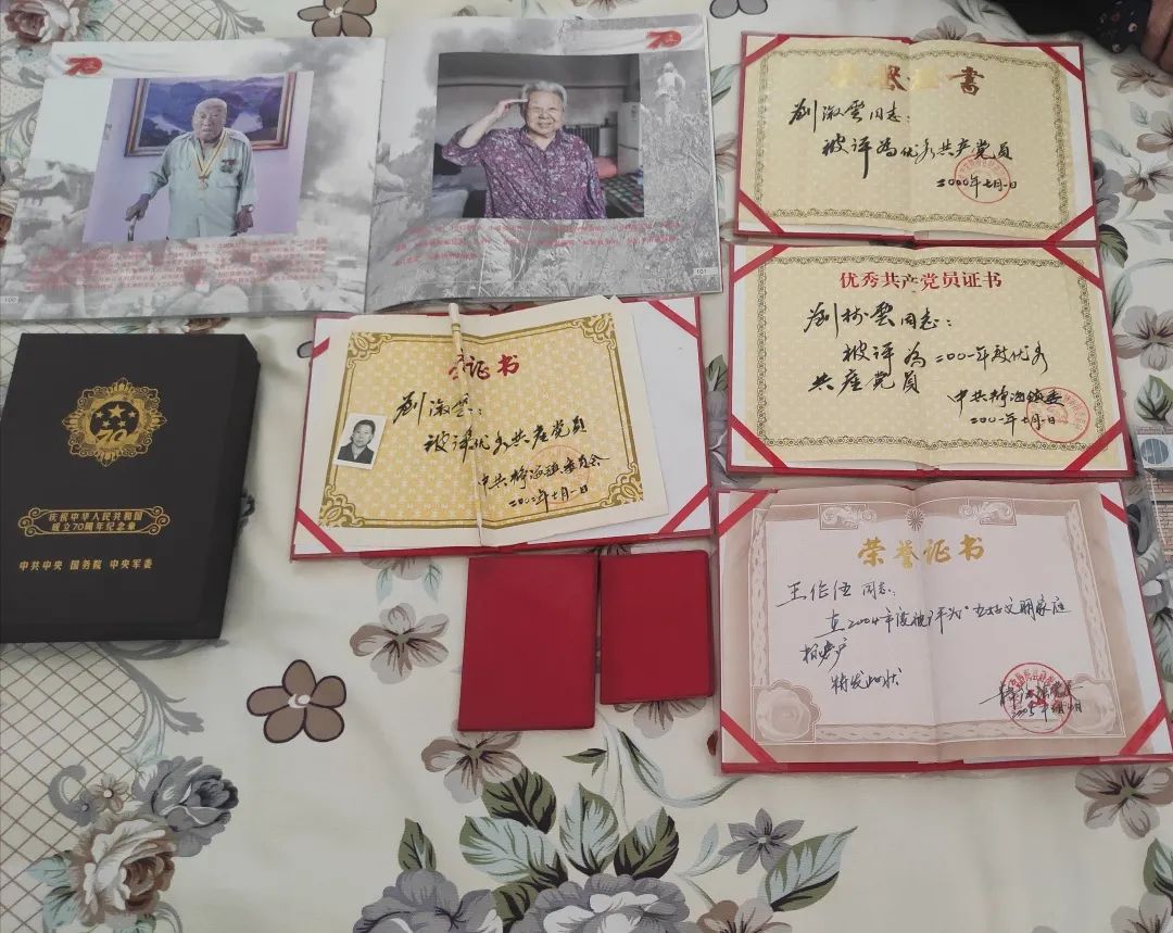 刘奶奶给我们展示了她入党参军的证书,获得优秀共产党员的荣誉证书,以及庆祝中华人民共和国成立70周年的纪念章。时隔70年,看到70年前的证书和70年后的奖章放在一起时,刘奶奶非常激动,她眼含泪花说到:“党和国家从来没有忘记过我们,我们的生活在很大程度上得到党和国家的照顾。”同时,奶奶也嘱托作为大学生党员的我们要好好学习,跟着党走,在以后的工作岗位上尽职尽责,为祖国做贡献。