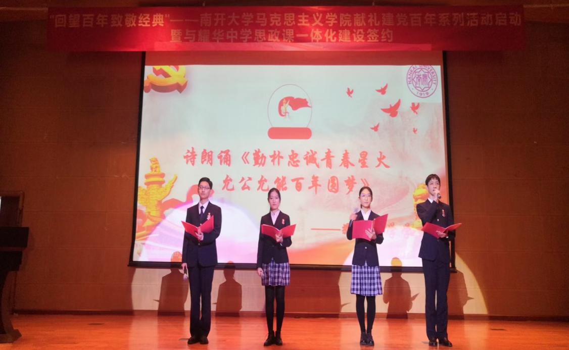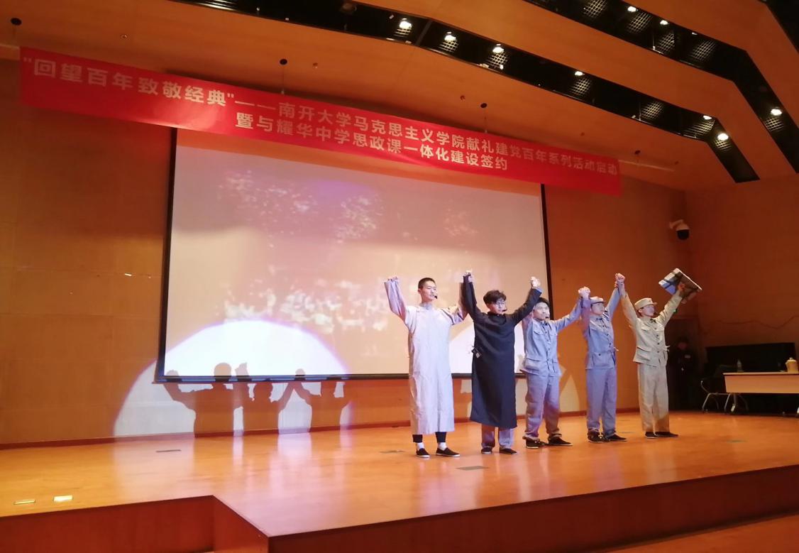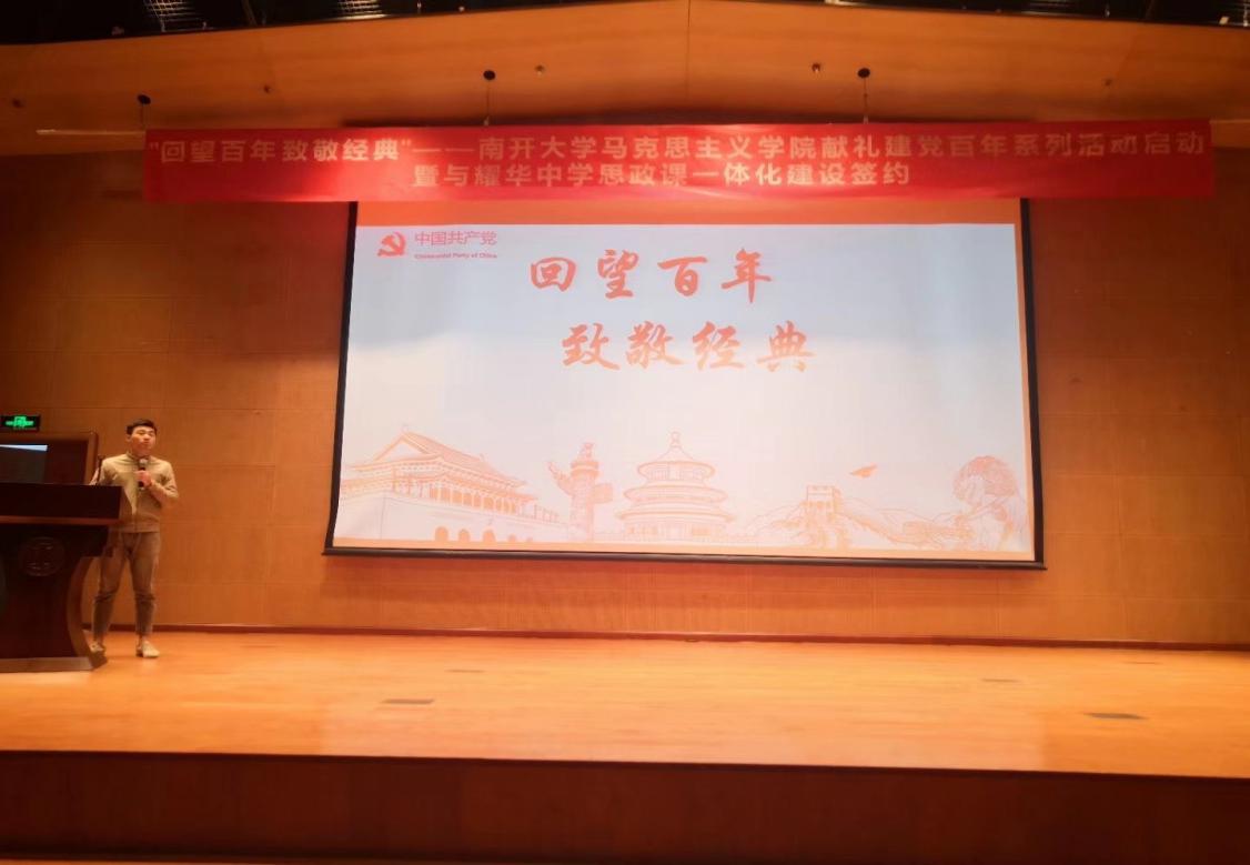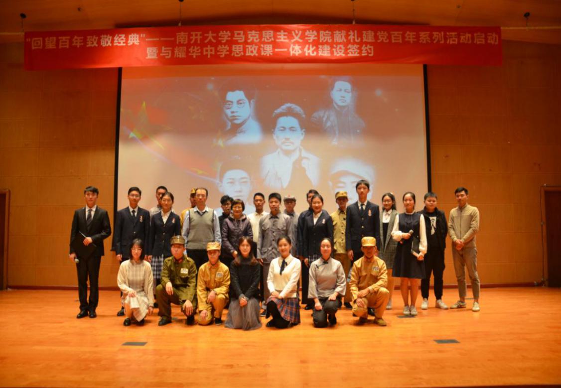 为庆祝中国共产党成立100周年,回顾百年历史,传承革命精神,贯彻落实习近平总书记关于深化新时代学校思政课改革创新,推动大中小学思政课一体化建设的要求,11月7日,必威BETWAY西汉姆联联合天津市耀华中学举办了“‘回望百年 致敬经典’——必威BETWAY西汉姆联献礼建党百年系列活动启动暨与耀华中学思政课一体化建设签约仪式”,学院党委副书记副院长刘一博、耀华中学党委书记王杰出席活动,学院部分师生与耀华中学师生代表共计百余人参会。
