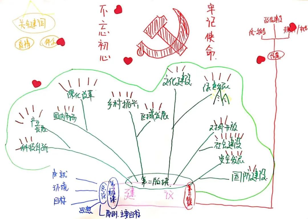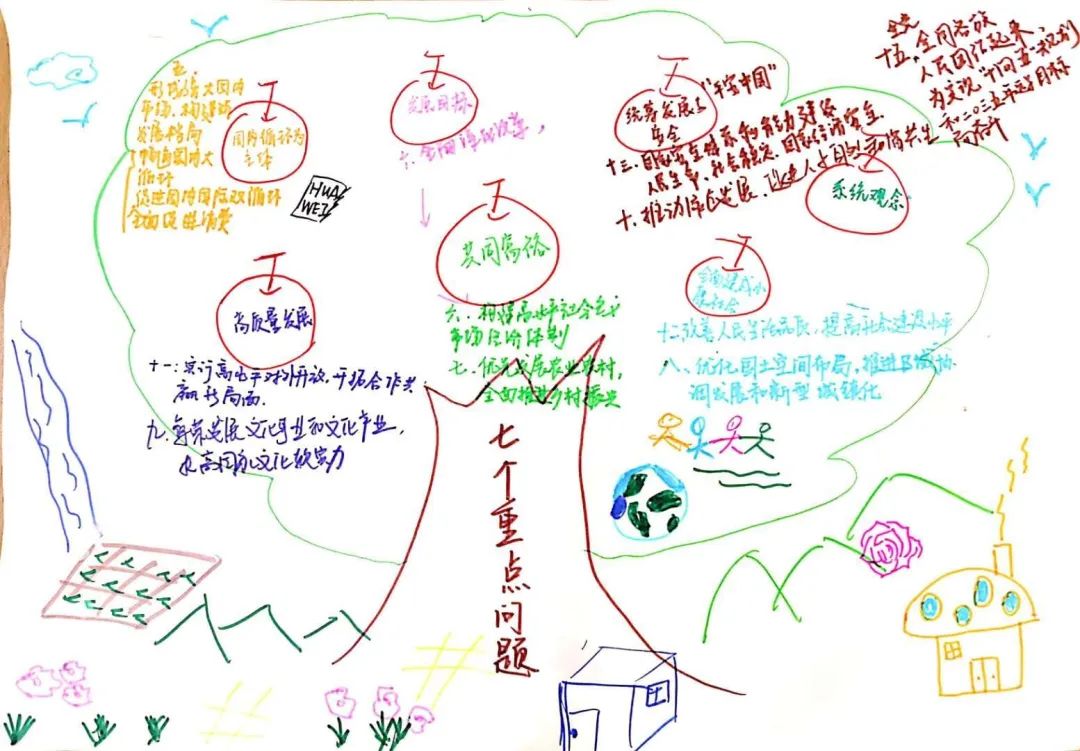 为创新学习形式,使同学们更深入、全面的了解《建议》内容,增强同学们在支部学习中的参与感和获得感,支部将同学们分成了5个小组,在阅读材料方面采用了“拼图阅读”的方式,即小组成员每人阅读一个部分,待所有小组成员阅读完毕后在组内分享,拼接完毕就是材料的整体内容,从而使同学们快速对材料形成一个整体认识;为保证同学们能够将《建议》内容入脑入心,在阅读环节后还加入了绘制思维导图的环节,小组成员合力在规定时间内制作出思维导图并进行展示,由全体参会同学投票选出最喜欢的思维导图,并为其颁发奖品。