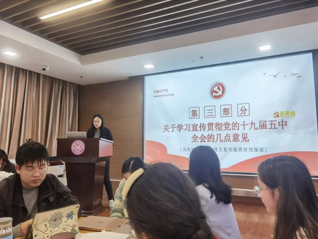 “党的十九届五中全会通过的《中共中央关于制定国民经济和社会发展第十四个五年规划和二〇三五年远景目标的建议》,明确了到二〇三五年基本实现社会主义现代化的远景目标,深刻指明了今后一个时期我国发展的指导方针、目标任务、战略举措,对于动员和激励全党全国人民继续抓好用好战略机遇期,推动全面建设社会主义现代化国家开好局、起好步,具有重大而深远的意义。”高田琪向支部同学们介绍了十九届五中全会的基本情况和重要意义,并围绕着公报的内容与主要精神进行导学,并鼓励同学们将会议精神与自身学习、研究相结合。