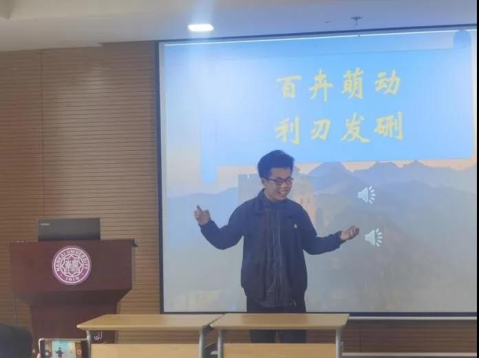然后,高海洋同学讲述了一些与共青团员相关的历史故事,同时也提到一个学期以来,我们在团校的学习和锤炼中从一个个懵懂的少年不断走向成熟。从学习党史到领悟党的十九届五中全会精神,在一次次的精神的洗礼中,我们坚定理想信念,在学习中升华、内省中完善、自律中养成、实践中锤炼。我们不仅学到了许多红色知识,也在参与中增强了启寤班集体的向心力和凝聚力。