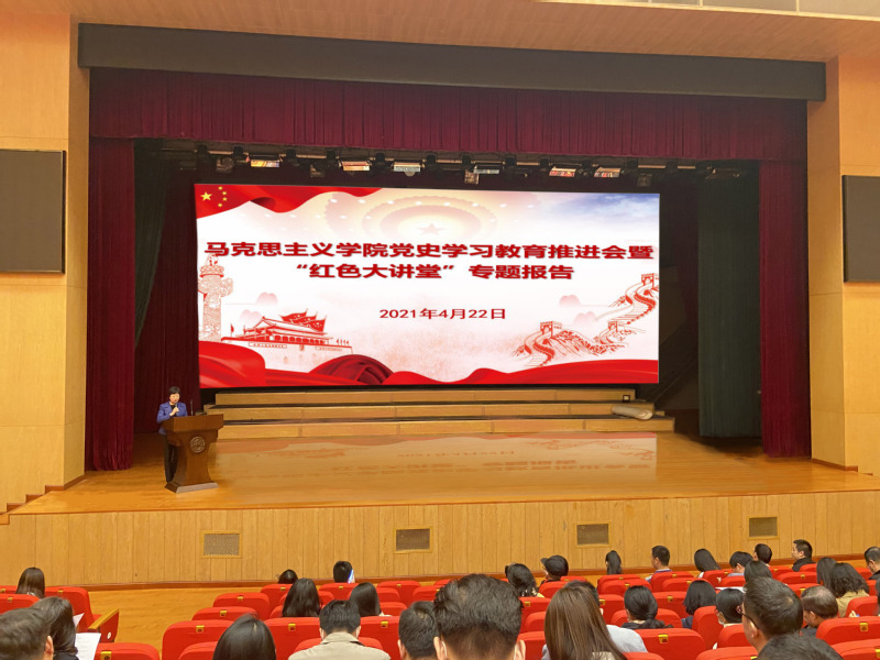 学院党委书记付洪面向全体师生党员作党史学习教育宣讲报告,并对下一阶段深入开展党史学习教育进行部署。她首先对党史学习教育开展以来各支部和各位党员积极行动所取得的阶段性成果表示肯定,并针对如何继续开展好党史学习教育提出了三点意见。她强调,推进党史学习教育要进一步深刻领会其重大意义,把思想和行动统一到习近平总书记重要讲话精神和党中央决策部署上来;要做好规定动作,准确把握党史学习教育的重点学习内容,高质量完成任务;要准确把握党史学习教育的目标要求,把学党史与学院的中心工作紧密结合,努力取得实实在在的成效。最后,付洪从党的建设、学科建设、思政课教师队伍建设、师生服务等七个方面对党史学习教育实施提出了指导性意见,并鼓励全体党员坚定信念、积极进取、勇于担当,齐心协力献礼建党百年。