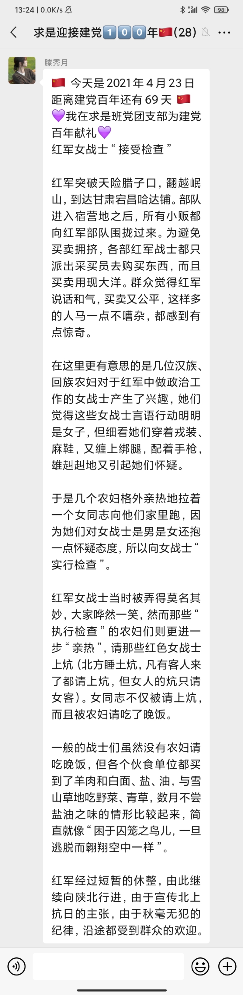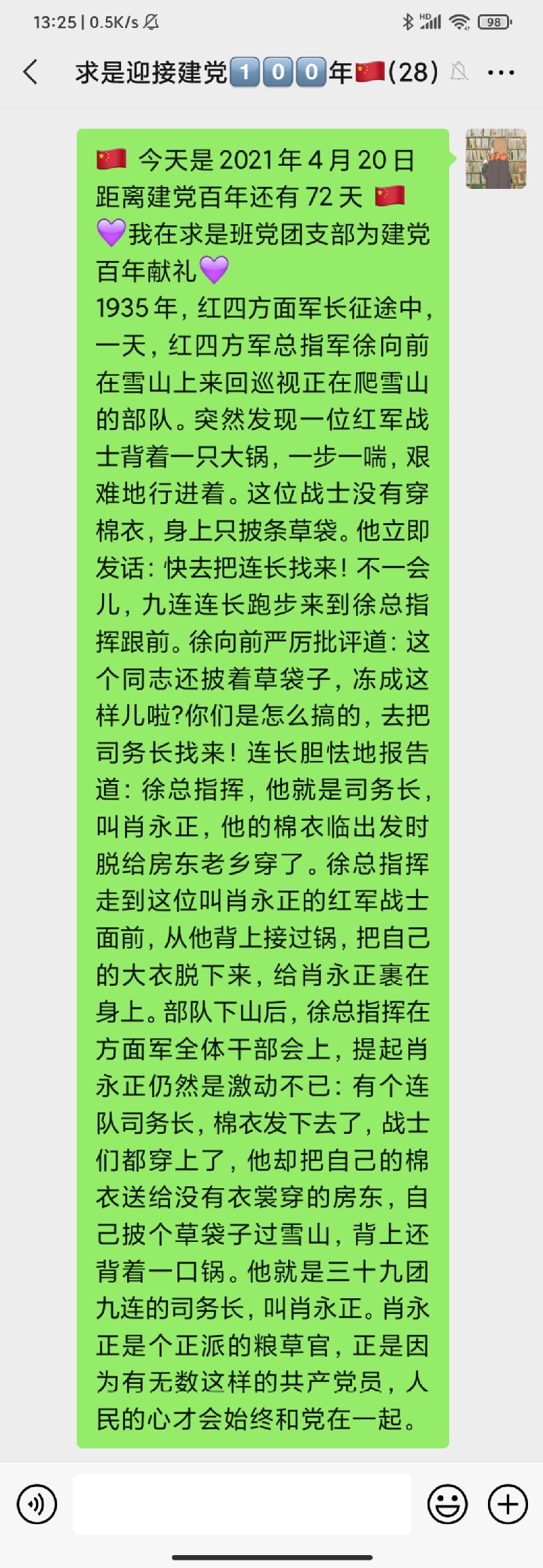 该活动自323日开展以来持续稳步推进,在求是班党团支部中引发了热烈反响,同学们表示,阅读每天的党史故事分享已经成为了睡前“必修课”。学习党史,不仅增强了同学们的知识储备,更让各位党员、团员同志了解了前辈的革命精神。求是班团支部成员付曙曦分享“邓小平在大别山区过新春”故事,让同志们进一步认识了共产党员联系群众的优秀作风。