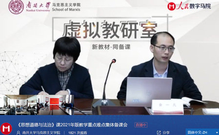 首先,余一凡老师按照章节顺序对新教材各章的重点难点进行解析,详细分析正确认识人的本质、高尚的人生追求以及中国精神内涵等教学重点难点。其次,他就《思想道德与法治(2021年版)》课教学提出四点建议:基于基本展开逻辑进行教学设计、基于科学研究解剖理论难题、基于现实社会中道德与法治冲突引发深入思考,以及基于改革开放生动实践加强思想引领。最后,参与直播的虚拟教研室的老师们就《思想道德与法治(2021年版)》教学重点难点问题与余老师进行了互动交流。