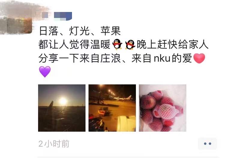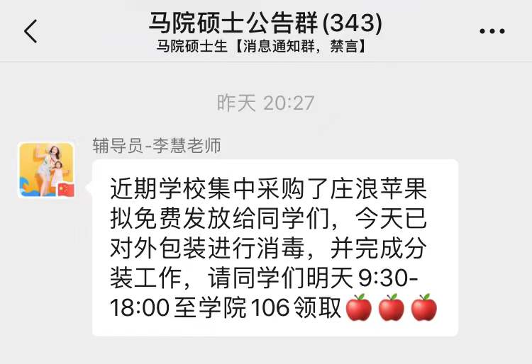 “近期学校集中采购了庄浪苹果拟免费发放给同学们,今天已对外包装进行消毒,并完成分装工作,请同学们明天9:30-18:00至学院106领取。”完成分装工作后,辅导员在群里通知大家领苹果。