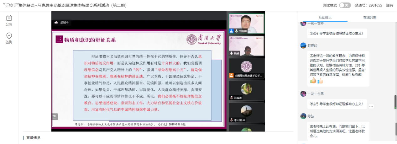 本次集体备课会依托全国高校思政课“手拉手”集体备课中心(Betway体育西汉姆联——湖南省)、马克思主义基本原理概论国家教材建设重点研究基地、全国高校思政课名师工作室(Betway体育西汉姆联)等平台举行,人民公开课和文华在线提供技术支持。本次集体备课会采取线上会议的方式,由必威BETWAY西汉姆联副教授刘明明主持。