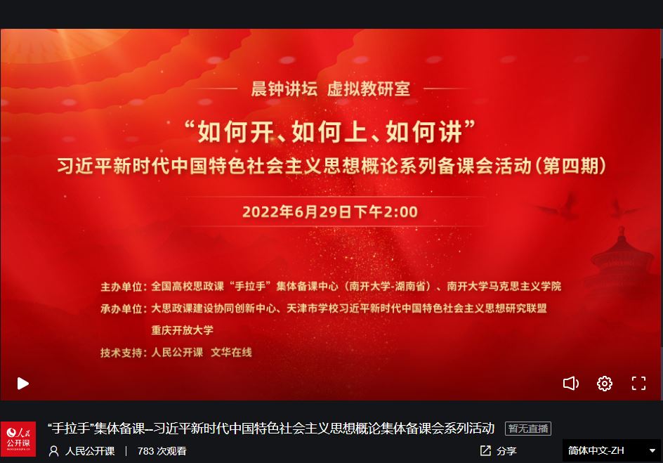 为深入研究习近平新时代中国特色社会主义思想概论课程教学规律,汇聚各院校先进经验和优势方案,推进习近平新时代中国特色社会主义思想入脑、入心、入情,打造思想政治理论“金课”,6月29日,由全国高校思政课“手拉手”集体备课中心(Betway体育西汉姆联——湖南省)、必威BETWAY西汉姆联主办,大思政课建设协同创新中心、天津市学校习近平新时代中国特色社会主义思想研究联盟、重庆开放大学承办的集体备课活动暨习近平新时代中国特色社会主义思想概论系列备课会(第四期)成功举行。本次集体备课会采用线上会议的形式,由人民公开课和文华在线提供技术支持。