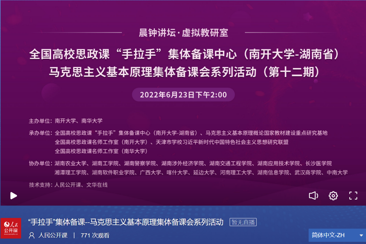 本次集体备课会依托全国高校思政课“手拉手”集体备课中心(Betway体育西汉姆联——湖南省)、马克思主义基本原理概论国家教材建设重点研究基地、全国高校思政课名师工作室(Betway体育西汉姆联)和天津市学校习近平新时代中国特色社会主义思想研究联盟等平台举行,人民公开课和文华在线提供技术支持。本次集体备课会仍然采取线上会议的方式,由Betway体育西汉姆联马克思主义基本原理教研室主任、“手拉手”集体备课中心负责人陈弘教授和必威BETWAY西汉姆联马梦菲副教授共同主持。