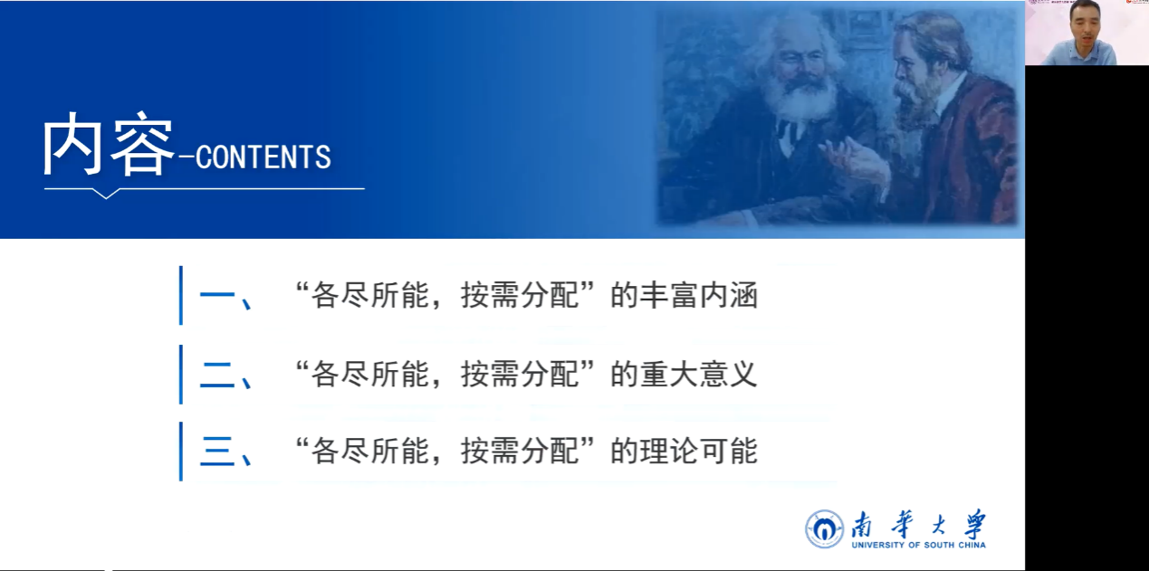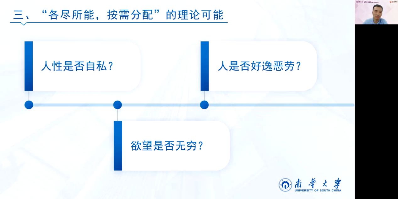 关于“各尽所能、按需分配”原则在理论上如何是可能的,邹老师指出这部分内容是共产主义理想遭受最大质疑所在。随着科学技术日新月异的发展,以及科学技术向社会生产力的有效转换,人们对共产主义能否实现的最大疑问已经不是生产力的发展和社会财富的创造问题,而转为对人性的理解。出于对人性的不同理解,导致对共产主义的质疑。比如人性是自私的,因此一方面人的欲望是无止境的,按需分配永无可能,人们不可能在无利益驱动的情况下做到各尽所能,因为劳动和工作通常被人们理解为功利性手段。总之,由于人性自私,人与人、人与自然的矛盾永远不可能得到彻底的真正的解决。邹老师针对这些质疑做出常识性回应,围绕三个问题展开:第一,人性是否自私?邹老师认为,人由自然属性决定的需要是有限度的,无论人性是否自私,都与无止境的欲望无关。第二,欲望是否无穷?邹老师指出,需要可以分为两种类型,即生物性保存与精神性认同,这两种基本需要在特定条件下会发生异化,如不平衡的竞争性资源分配导致焦虑、外在认同、心理贫困和无限占有。第三,人是否好逸恶劳?劳动或工作具有两种功能与属性,即服务于外在功利性目的和服务于内在超越性目的。人们厌恶那种对人来讲是折磨和牺牲的强制性劳动,却并不必然厌恶那种对人来讲是肯定和享受的自由劳动。