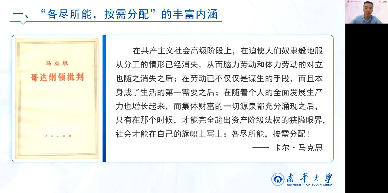 接着,集体备课会邀请南华大学邹平林老师做了题为“共产主义的原则——各尽所能、按需分配”的教学展示,对应教材第七章第一节“展望未来共产主义新社会”。邹老师提到,在实际教学当中,很多老师对这一章节的讲解较为简略,很难有效解答学生关于共产主义理想社会及其是否可能实现等方面的困惑。他认为“各尽所能、按需分配”是共产主义的核心原则和鲜明特征,对这一原则的丰富内涵、重大意义和理论可能进行深入阐释,有助于学生更深层次地理解和掌握这一知识点。他强调指出,这部分内容具有较强的理论性和思辨性。