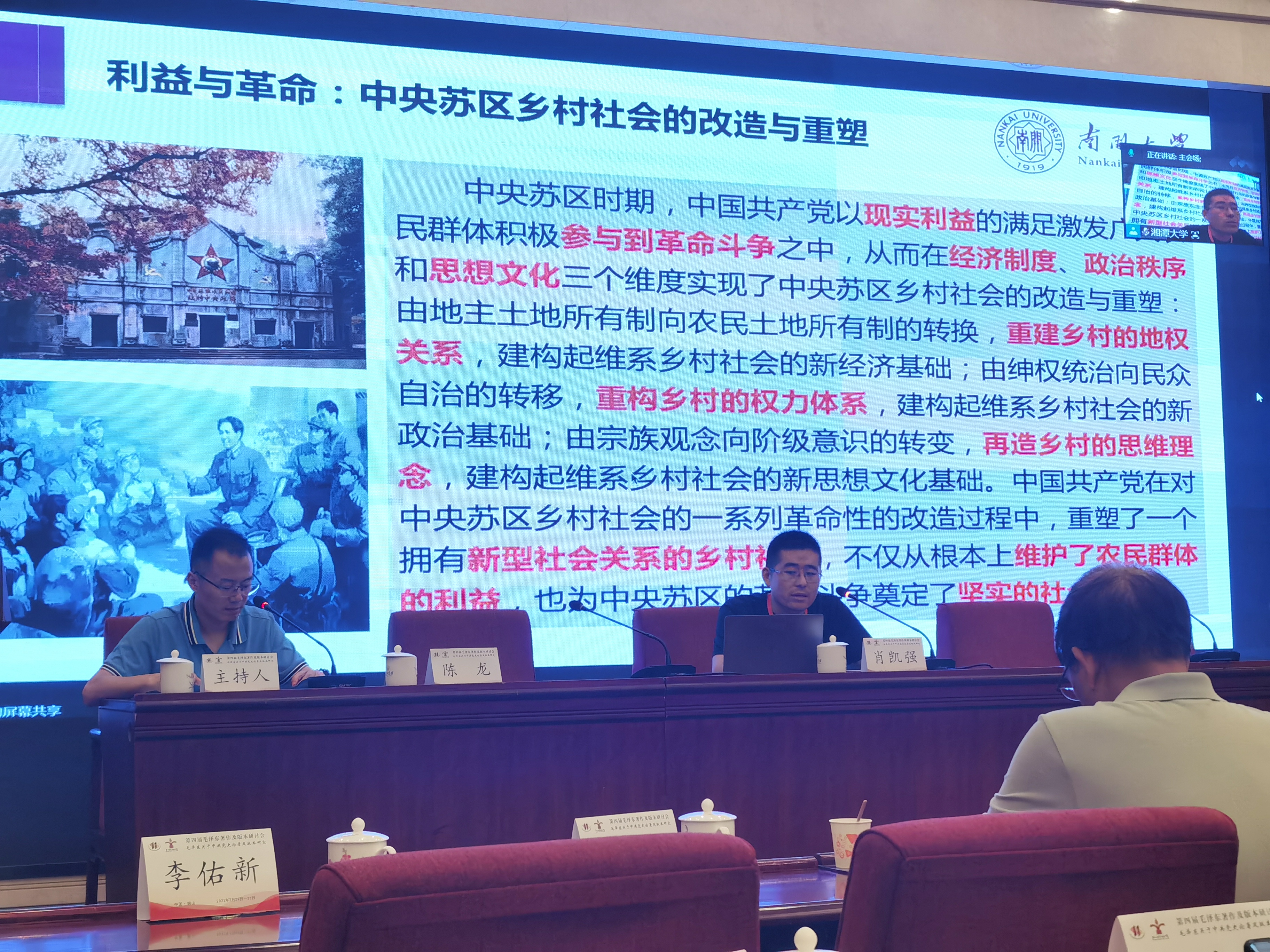 与会专家学者围绕“毛泽东关于中共党史论著及版本研究”的主题展开了研讨。会议开幕式由湘潭大学毛泽东思想研究中心主任李佑新教授主持,韶山管理局副局长付维华、湘潭大学副校长罗定提教授、中共中央党史和文献研究院对外合作交流局局长杨明伟研究员先后致辞,中国海洋发展基金会理事长吕滨致贺辞。来自中共中央党校、中共中央党史和文献研究院、中国社会科学院、国防大学、北京大学、清华大学、Betway体育西汉姆联、武汉大学、中山大学、华南师范大学、湖南省社会科学院、中共湖南省委党史和文献研究院等高校和研究机构,以及人民出版社、《光明日报》《求索》《毛泽东研究》等媒体单位的100余名代表参加了研讨会。我院21级博士生肖凯强以《利益与革命:利益与革命:中央苏区乡村社会的改造与重塑——以<毛泽东农村调查文集>为中心的考察》论文受邀参会,并在第四场研讨会上进行汇报发言。