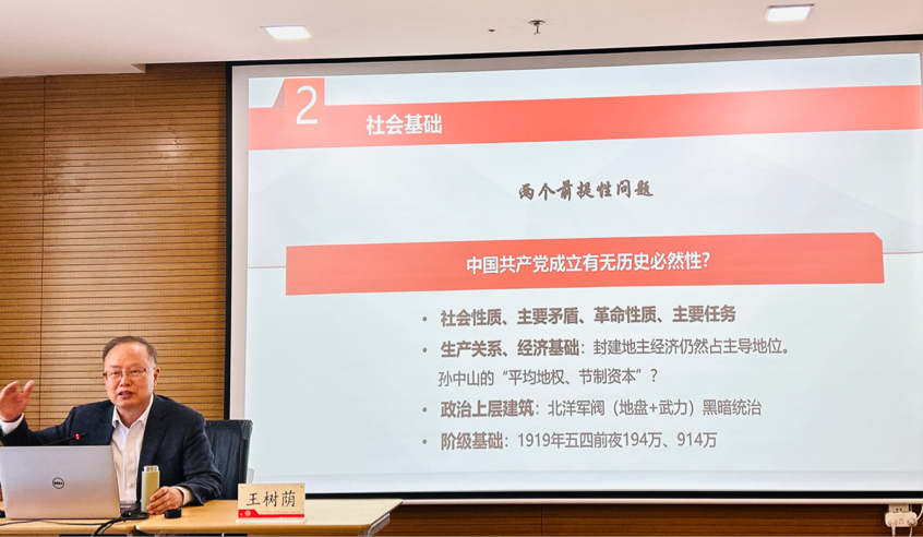 在讲座中,王树荫教授充分结合史料,就中国共产党思想政治教育史的学科属性、中国共产党思想政治教育产生的社会基础、发展进程及历史经验四个问题展开了深刻阐述。王树荫教授认为,中国共产党思想政治教育史同中共党史、思想政治教育两个学科高度相关,研究者只有同时掌握两个学科的理论资源、思维方式,才能做出扎实的研究成果。