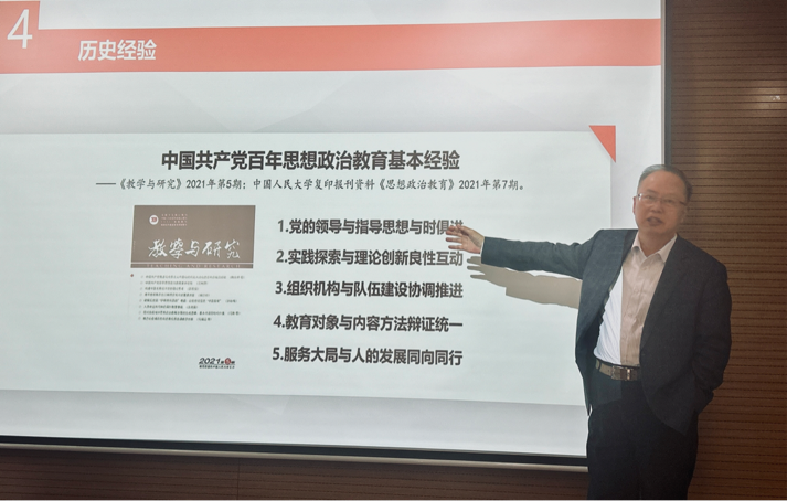 在讲座的最后,王树荫教授分享了中国共产党思想政治教育研究的方法和心得。一是要体现思想政治教育的特殊性;二是要反映思想政治教育历史脉络;三是正确处理历史经验与政治路线的关系;四是经验研究要具体化、阶段化、专题化。
