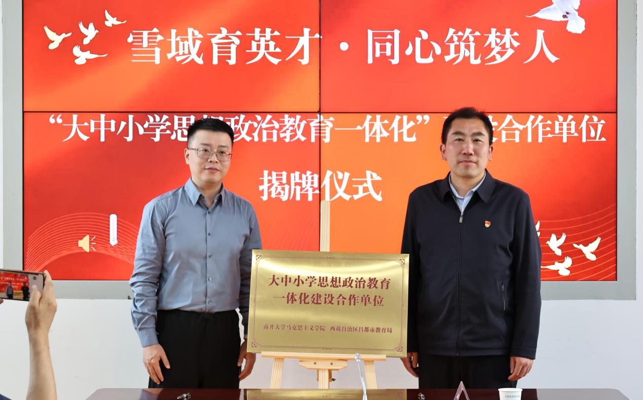 兰昊随后分别向昌都市教育局和昌都市实验小学授予了合作牌匾,并赠送了我院编写的相关教学指导方案和研究书籍。学院青年教师宁悦、张玉杰受聘首批市大中小学思政教育一体化建设项目指导专家。