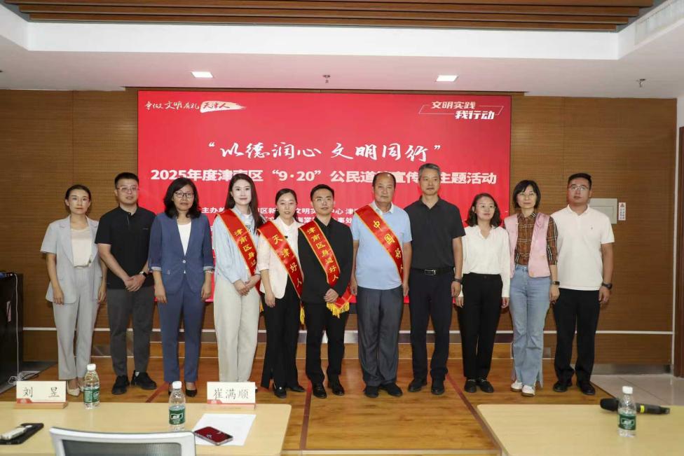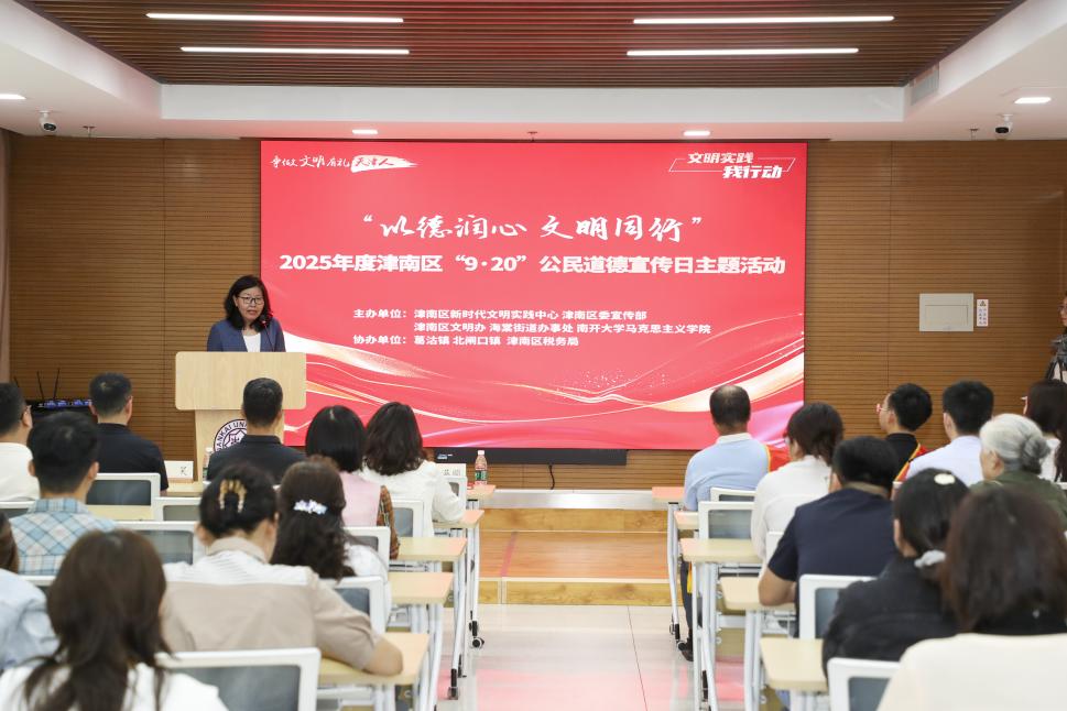 2025年9月19日,在第23个全国公民道德宣传日来临之际,“以德润心 文明同行”2025年度津南区“9·20”公民道德宣传日主题活动,在必威BETWAY西汉姆联举办。活动以“身边榜样讲故事、校地联动传文明”为核心,用鲜活事迹传递道德温度,让文明新风在百年学府落地生根。津南区道德模范、相关街镇新时代文明实践所站负责人及群众代表和学院师生代表近百人参加。