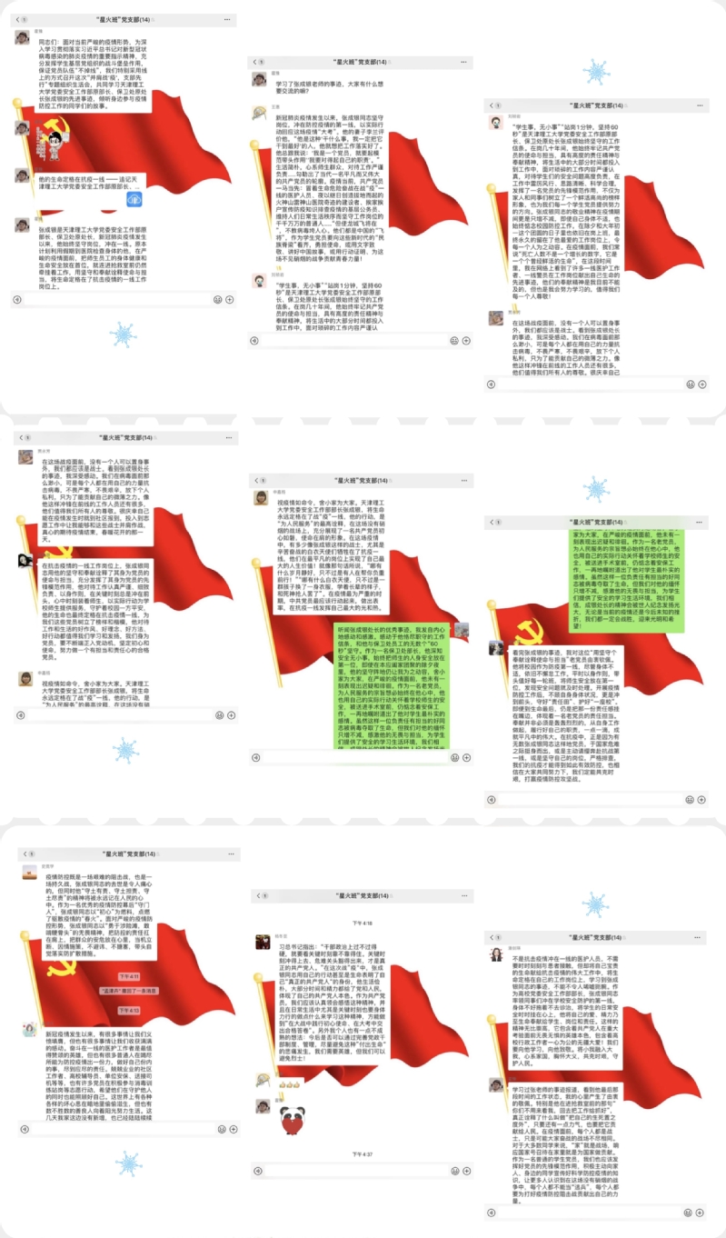 当前,新型冠状病毒感染肺炎疫情的防控工作正处于关键时期,举国上下众志成城。为进一步深入贯彻落实习近平总书记对防疫工作的重要指示精神,充分发挥大学生群体基层党组织的战斗堡垒作用,保证党员队伍“不掉线”,及时关注防疫工作最新进展,必威BETWAY西汉姆联2019级硕士生“星火”班党支部采用线上方式召开了一次以“并肩战‘疫’,支部先行”为专题的组织生活会。旨在通过学习天津理工大学党委安全工作部原部长、保卫处原处长张成银的先进事迹,倾听身边参与疫情防控工作志愿者背后的故事,集思广益、交流分享作为一名党员,在这场全民防疫阻击战中,我们将如何最大限度地发挥党员的先锋模范作用,借助线上线下多平台为防疫工作贡献自己的一份微薄之力。